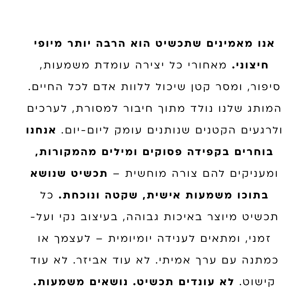 אתם בוחרים את הפסוק שמדבר אליכם – זה שמחזק, שמרגיע, שמזכיר מי אתם ומה חשוב לכם באמת. ואנו משלבים אותו כחלק בלתי נפרד מהיצירה, בעיצוב נקי ועל־זמני שנשאר קרוב ללב בכל רגע של היום זו אינה רק מתנה – אלא חוויה אישית של בחירה וחיבור. מתנה עמוקה לאדם קרוב, או החלטה שקטה להעניק לעצמכם משמעות שמלווה אתכם, מחזקת את הנפש ומכניסה יציבות ושקט אל תוך היום־יום.